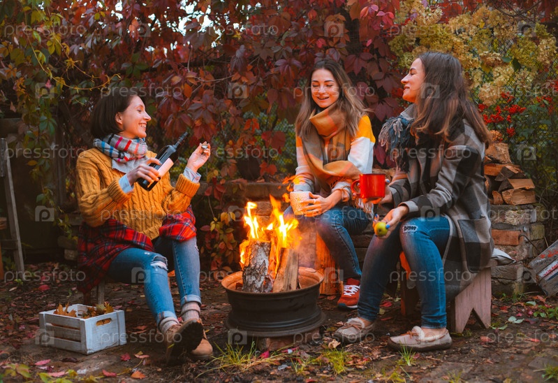 Три счастливые радостные лучшие подруги в теплой вязаной одежде сидят в осеннем саду у костра с бутылкой красного вина и кружками, разговаривают и смеются, наслаждаясь холодным вечером в сельской местности