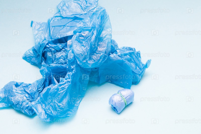 Много синих бахил на синем фоне, пространство для копирования, небольшая пачка бахил, перевязанных резинкой