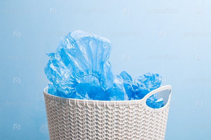 Много синих бахил в корзине, новые или бывшие в употреблении бахилы, защита от грязи, пространство для копирования на синем фоне