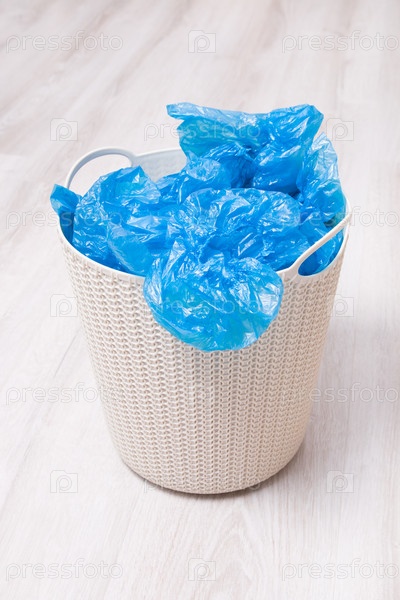 Много синих бахил в корзине, новые или б/у бахилы, защита от грязи