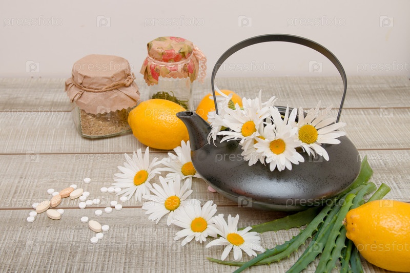 Различные таблетки, черный чайник с ромашками и разные банки чая на сером деревянном столе, сезонные, натуральные лекарства, лечение простуды