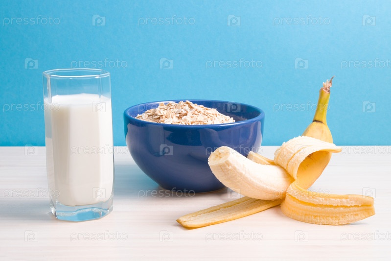Синяя миска с сухой овсянкой, стейк из молока и банана на деревянном столе, синий фон, концепция правильного питания, здоровый образ жизни, овсянка с бананом на завтрак