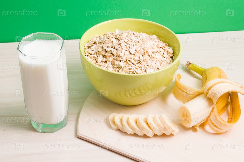 Зеленая миска с сухой овсянкой, стейком молока и нарезанным бананом на деревянном столе, зеленый фон, концепция правильного питания, пространство для копирования