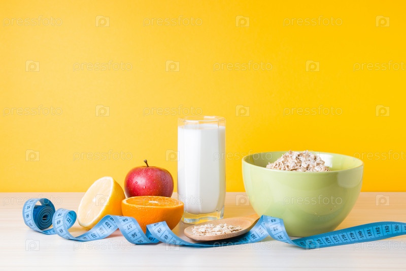 Стакан молока, фрукты, миска овсянки и синяя измерительная лента на столе, желтый фон, концепция здорового образа жизни, правильное питание и потеря веса