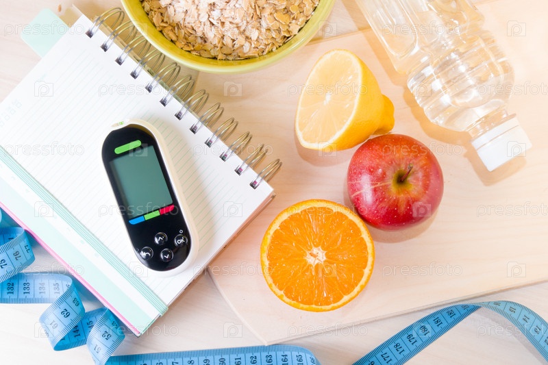 Глюкометр в блокноте, концепция контроля уровня сахара в крови, миска овсянки, измерительная лента, фрукты, бутылка воды на деревянном столе, питание для диабетиков