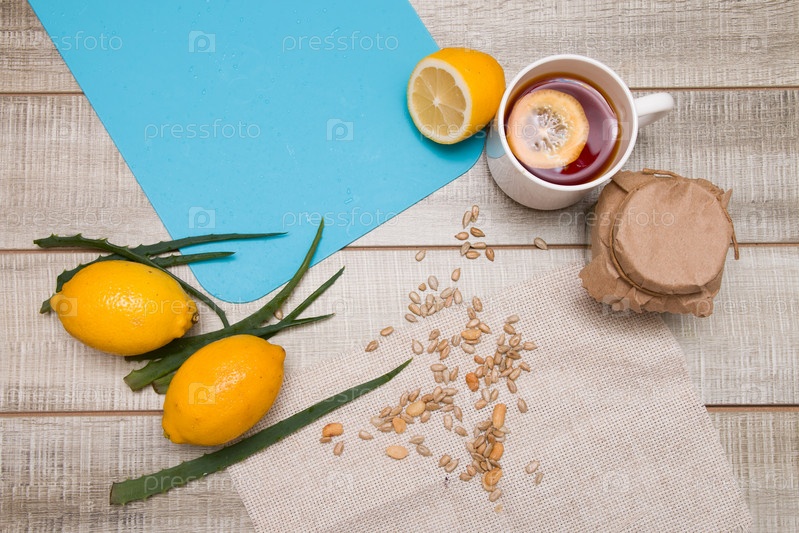 Натуральная медицина, алоэ, ромашка, чай с лимоном, ползучие орехи и семена на серо-голубом фоне, пространство для копирования, лимоны, чайные листья