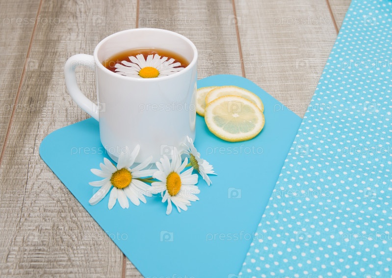 Белая чашка с ромашковым чаем на синей разделочной доске с цветами ромашки, нарезанным лимоном и тканью в горошек на сером деревянном столе
