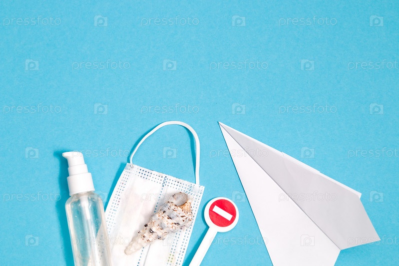 Знак стоп, ракушка, спиртовой антисептик для рук, защитная маска и бумажный самолетик на синем фоне опиумных пятен, вид сверху, карантин 2020, отмена рейсов