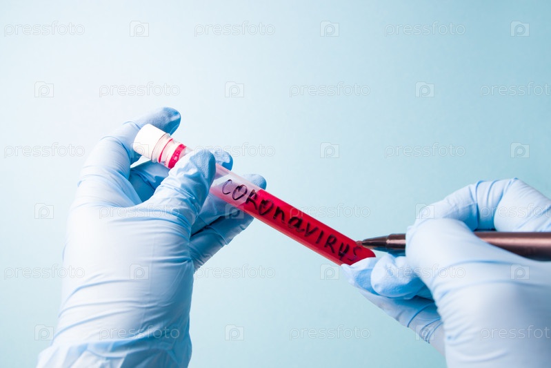 Руки в синих медицинских одноразовых резиновых перчатках держат и подписывают пробирку с красной кровью, надпись коронавирус на пробирке, пространство для копирования на синем фоне, крупный план