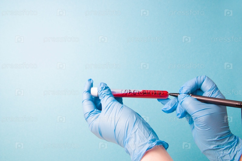 Руки в синих медицинских одноразовых резиновых перчатках держат и подписывают пробирку с красной кровью, надпись коронавирус на пробирке, пространство для копирования на синем фоне, крупный план