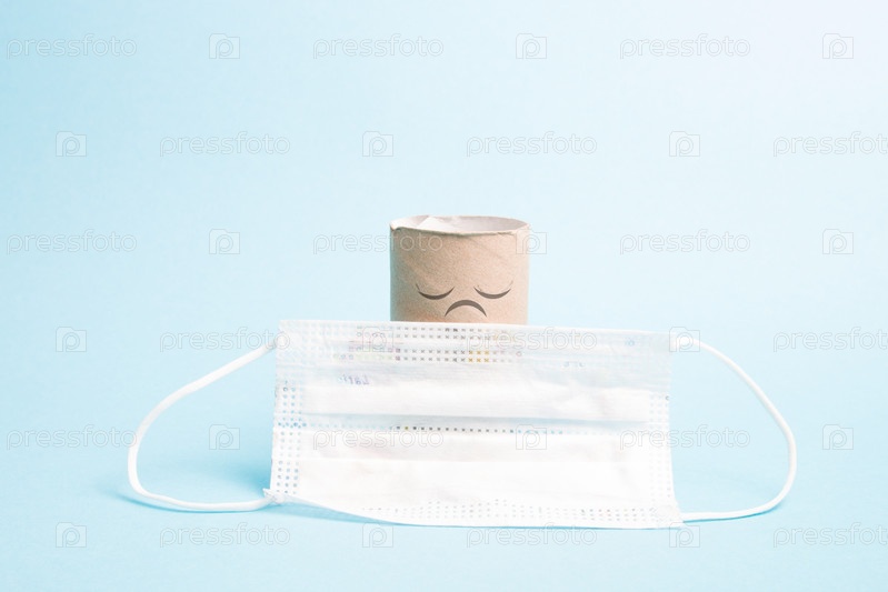 Рукав туалетной бумаги с раскрашенным грустным лицом и защитной белой маской для детей на синем фоне копией пространства, грустная туалетная бумага