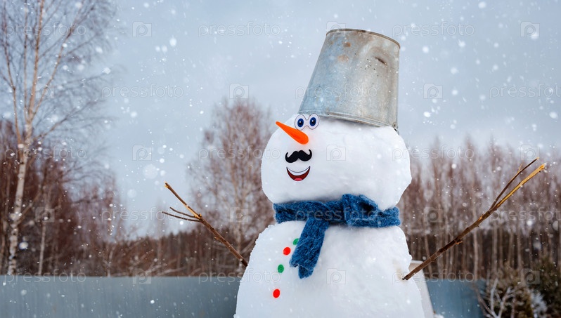 Милый открытый снеговик. Снежное новогоднее рождественское веселье