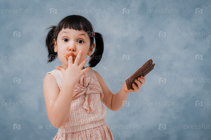 Маленькая девочка ест шоколад и облизывает палец на фоне серо-голубой студии. свободное место
