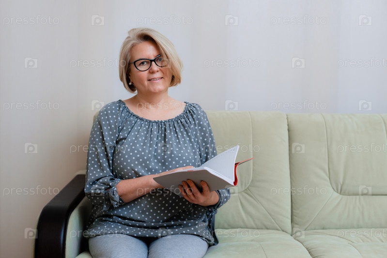 Блондинка-бизнесвумен, улыбающаяся и пожилая, в очках, читающая и просматривающая ежедневник и шариковую ручку. Портрет красивой ухоженной пенсионерки 50-60 лет в комнате