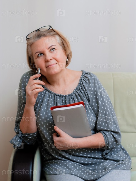 Блондинка-бизнесвумен, улыбающаяся и пожилая, в очках, читающая и просматривающая ежедневник и шариковую ручку. Портрет красивой ухоженной пенсионерки 50-60 лет в комнате
