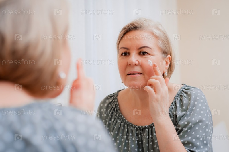Счастливая здоровая зрелая женщина у зеркала наносит антивозрастной увлажняющий косметический крем на лицо, улыбающаяся дама средних лет, мягкий уход за чистой кожей и красота