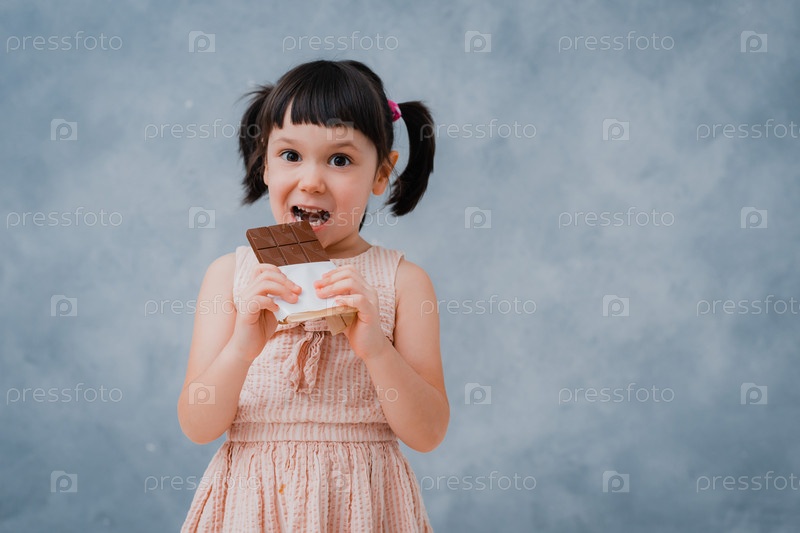 Маленькая девочка ест шоколад и облизывает палец на фоне серо-голубой студии. свободное место