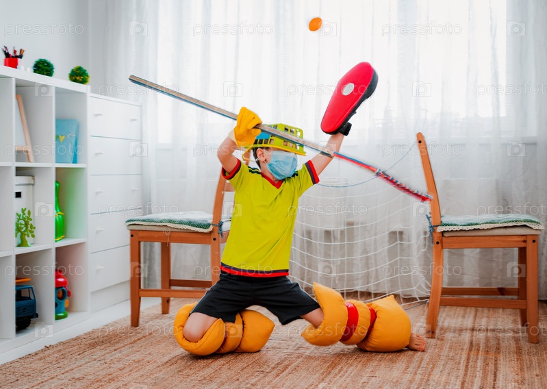 Мальчик играет дома в хоккей, соорудив своими руками форму из подручных средств и ворота из стульев