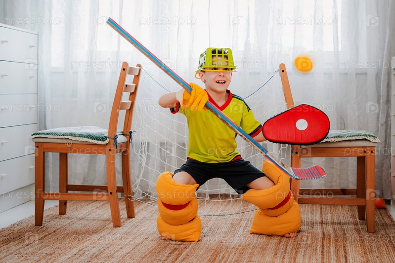 Мальчик играет дома в хоккей, соорудив своими руками форму из подручных средств и ворота из стульев