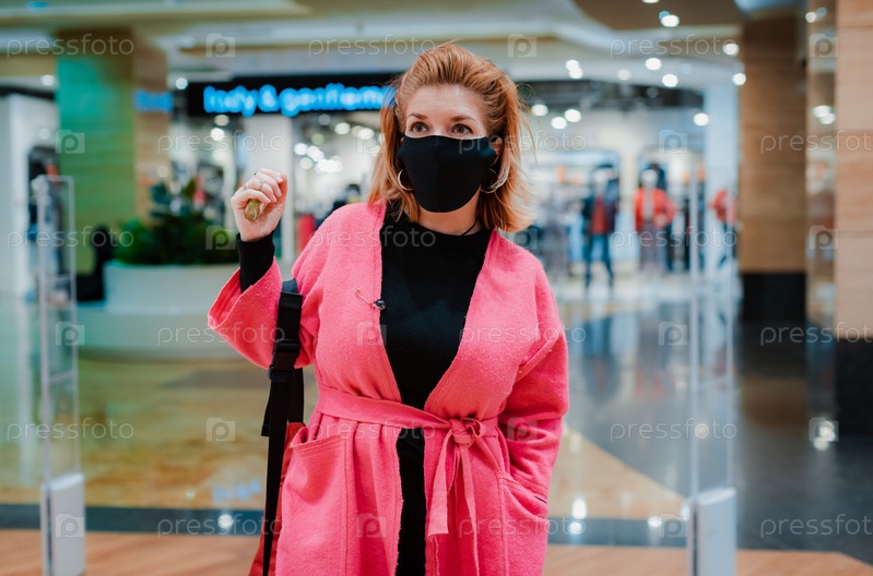 Красивая женщина с телефоном ярко-розовое пальто торгового центра с черной защитной маской на лице от зараженного вирусом воздуха