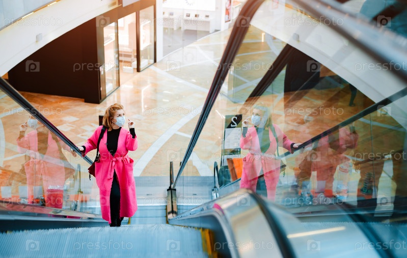 Красивая женщина в ярком пальто едет на эскалаторе торгового центра в черной защитной маске на лице от загрязненного вирусом воздуха