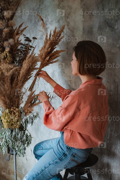 Женщина-флорист украшает вечный букет из сухоцветов на прилавке в своей цветочной студии. Такая женщина-предприниматель, которая составляет букет из сухоцветов