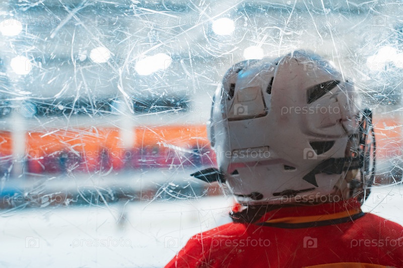 Детский хоккей. Детский хоккеист в защитной форме на стеклянной стороне ледового поля