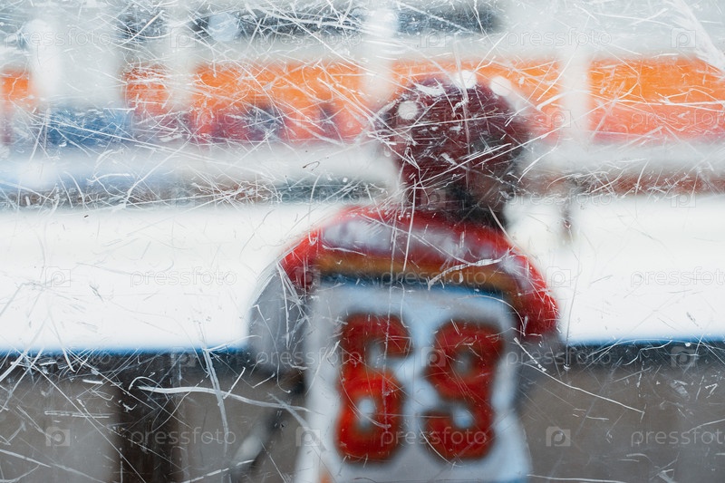 Детский хоккей. Детский хоккеист в защитной форме на стеклянной стороне ледового поля. Абстрактный выборочный фокус на царапинах на стекле