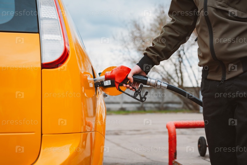 Неузнаваемый мужчина заправляет машину бензином на заправке. Концепция высоких цен на бензин