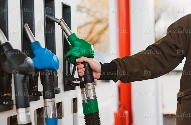 Неузнаваемый мужчина заправляет машину бензином на заправке. Концепция высоких цен на бензин, санкции, Россия