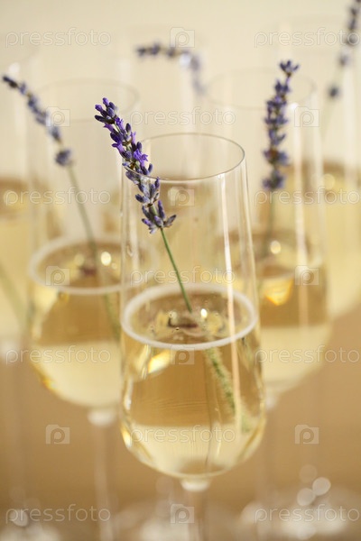 Бокалы шампанского, украшенные лавандой на размытом фоне