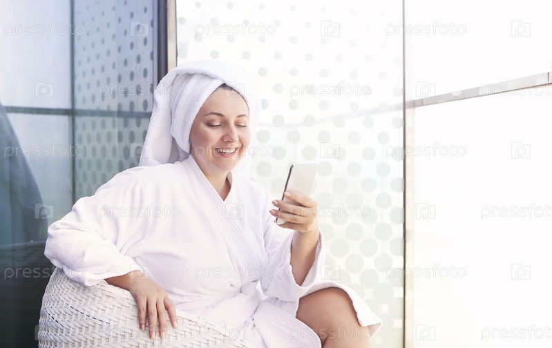 Женщина в халате на балконе во время использования смартфона