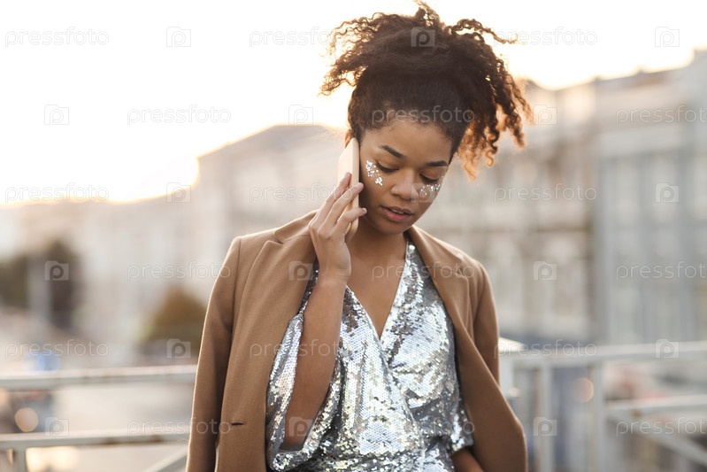Африканская американка с блестками на скулах в платье с блестками разговаривает по мобильному телефону на крыше