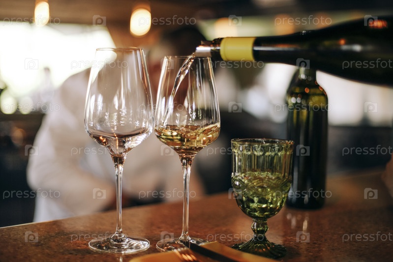 Бутылка вина и бокалы на столе на фоне винного ужина