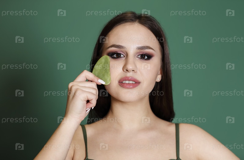 Привлекательная молодая женщина, держащая зеленый камень гуа ша рядом с лицом и смотрящая в камеру