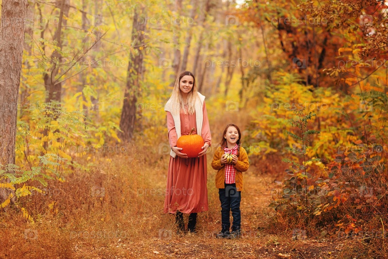 Молодая семья, мать и маленький сын, на прогулке в осеннем лесу, мама и ребенок держатся за руки и идут по тропинке, покрытой желтыми листьями деревьев