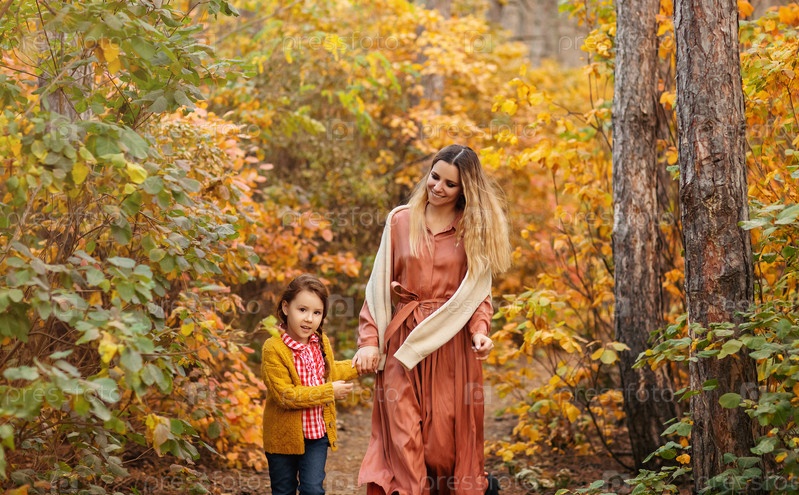 Молодая семья, мать и маленький сын, на прогулке в осеннем лесу, мама и ребенок держатся за руки и идут по тропинке, покрытой желтыми листьями деревьев