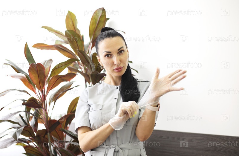 Молодая женщина-профессиональный косметолог в медицинской форме и перчатках, готовая к инъекции, стоя в клинике красоты