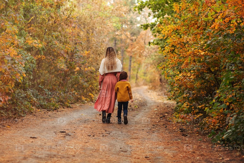 Мать и маленький сын на прогулке в осеннем лесу, идут по тропинке, покрытой желтыми листьями деревьев