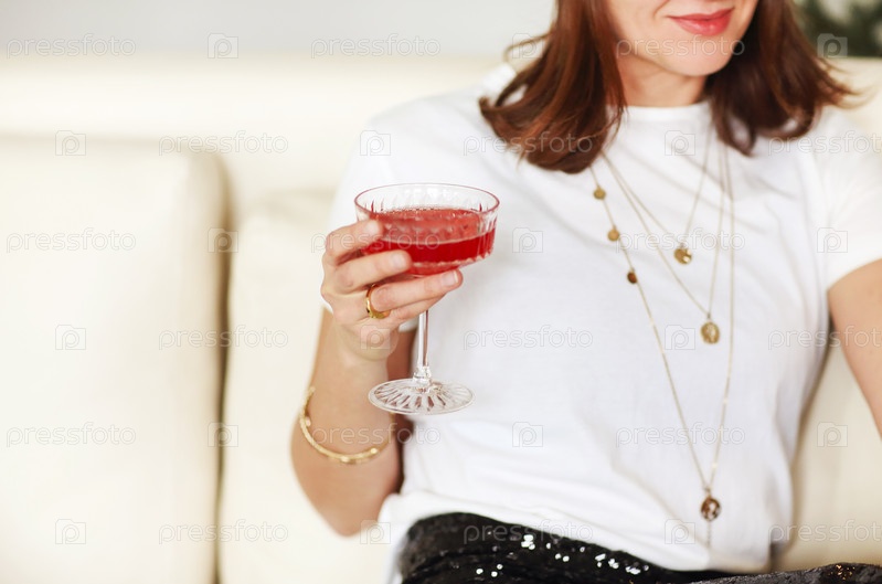 Молодая улыбающаяся женщина держит в руке бокал для коктейля с красным алкогольным напитком, сидя дома на диване