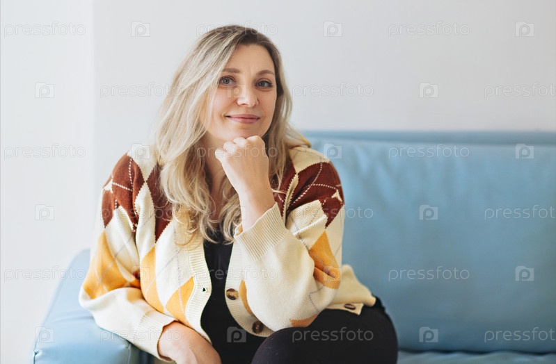 Портрет улыбающейся красивой женщины средних лет со светлыми волосами, сидящей дома на диване