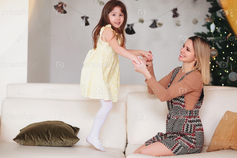 Игривая маленькая девочка, играющая с позитивной мамой, прыгающая на диване во время рождественских каникул