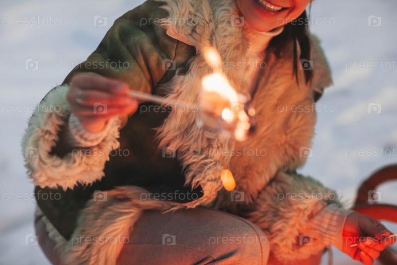 Счастливая женщина жарит сладкий зефир на костре в зимнем лесу