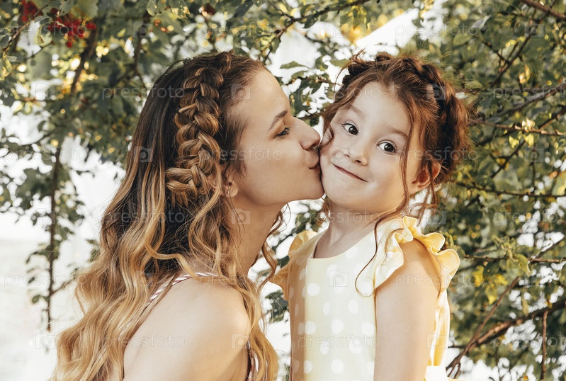 Любящая молодая мать целует прекрасную маленькую дочь в щеку, проводя время вместе в саду
