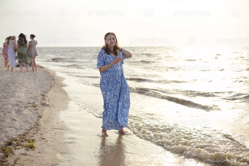 Счастливая взрослая женщина с вином отдыхает на пляже