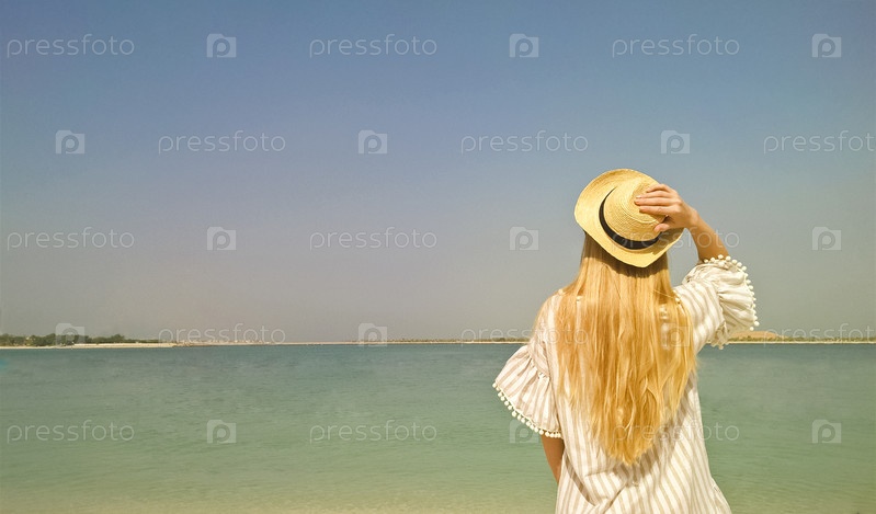 Молодая женщина в летнем платье с соломенной шляпой