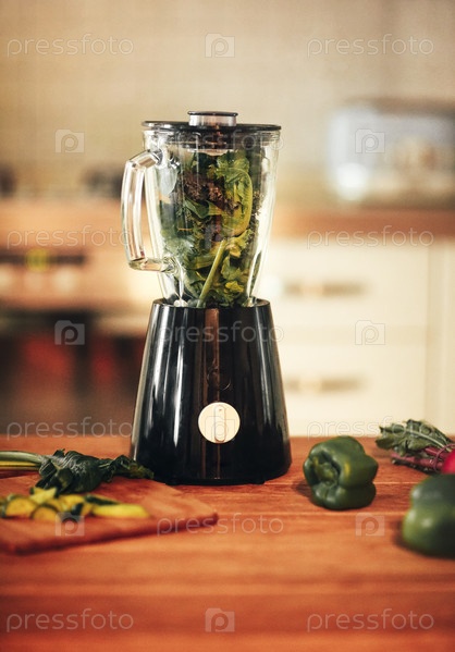 Блендер для смузи из зеленых овощей на кухне с листьями капусты внутри