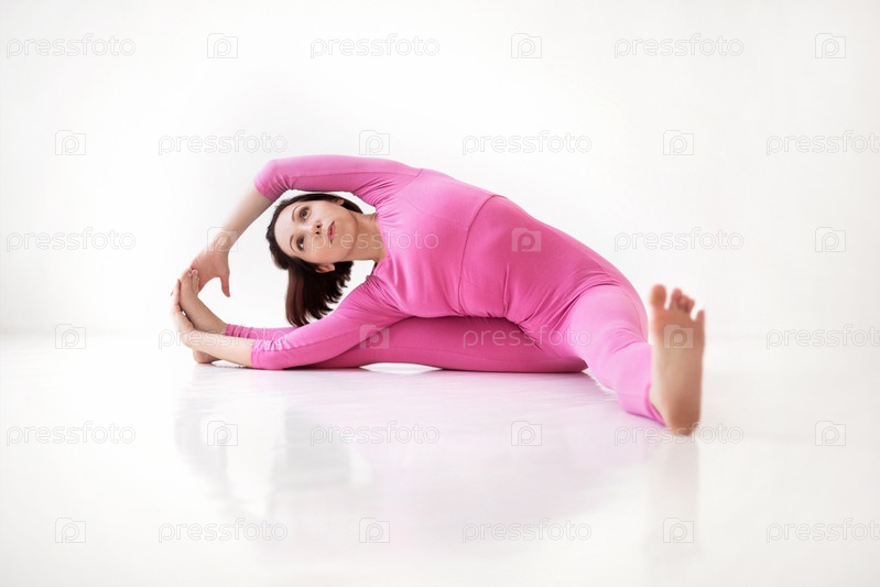Молодая стройная женщина в розовом длинном комбинезоне, выполняющая позу йоги, изолированная на белом фоне студии