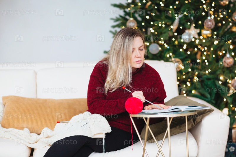 Женщина средних лет сидит на диване в гостиной и вяжет одеяло с узорами спицами