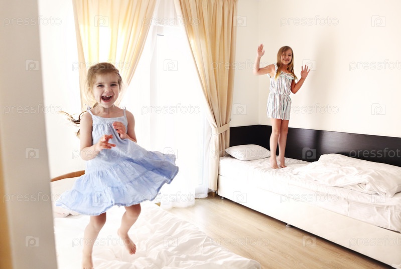Две милые беззаботные сестрички в повседневной одежде играют в детской комнате